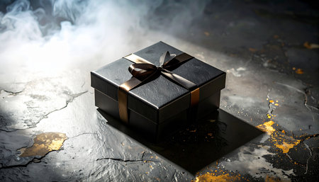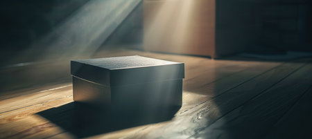 A closed box sits on a wooden floor, illuminated under dramatic lighting, emphasizing its sleek design. the focus on the packaging's details creates anticipation and intrigue, ideal for presentations, advertisements, and marketing campaigns.