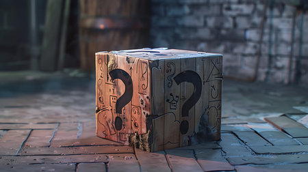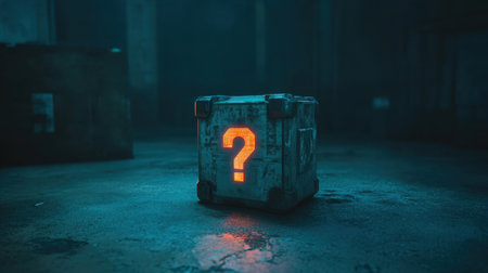 This captivating image showcases a glowing box marked with a question mark, set against a dark industrial backdrop, evoking feelings of intrigue and suspense.