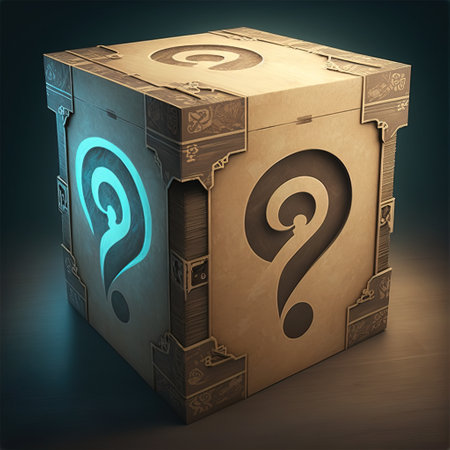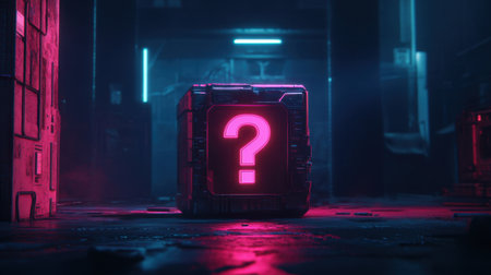 A captivating image of a mysterious glowing box featuring a question mark, set against a dark futuristic background with neon lights, evoking curiosity and intrigue.