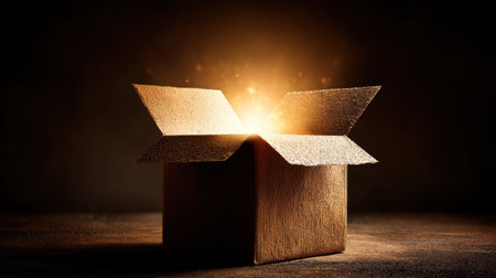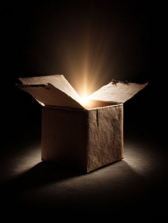 A cardboard box opens to reveal a captivating glow inside. The light shines brightly, creating an air of mystery in the dimly lit environment.
