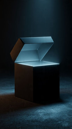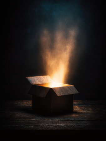 An intriguing image of an open box releasing a warm, glowing light, symbolizing discovery and surprise. The dark background enhances the captivating atmosphere, inviting exploration.