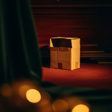 A cardboard box stands open, releasing a warm, glowing light in the darkness of a cozy room, creating a magical preparation for a surprise reveal.
