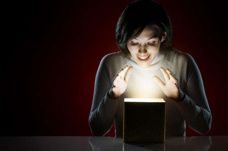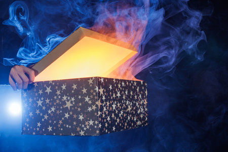 mystery box with semi-open lid revealing bright light coming from the inside, concept of positive surprises or magic