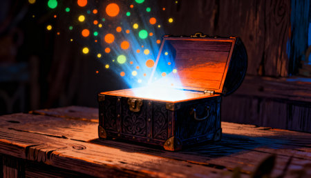 An old, open wooden treasure chest emits a bright, magical blue light and colorful, glowing orbs that float upwards, set on a rustic wooden table in a dimly lit, atmospheric room.