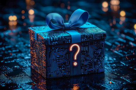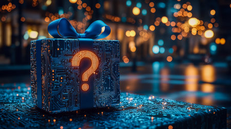 A sleek, tech-inspired box featuring intricate circuit patterns and a luminous question mark, set against a backdrop of gentle night bokeh lighting fo
