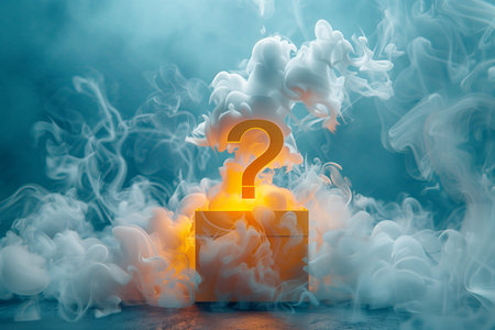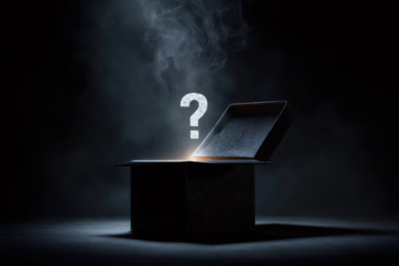 Mysterious black box slightly open with a glowing question mark made of smoke coming out of it on a dark background