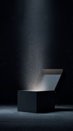3d rendering of an empty box in dark room with light coming from above