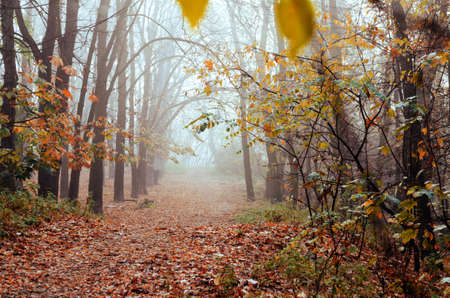 Autumn forest road leaves view in day foggy. Cold foggy morning in horror forest