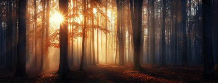Golden autumn sunlight filters through dense forest trees, illuminating misty air and creating tranquil, magical woodland atmosphere