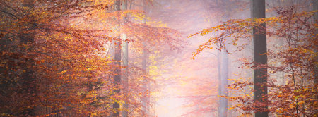 Fantastic Mysterious Foggy Morning in the Autumnal Forest. Moody Background with Colorful Trees. Fall seasonal background.