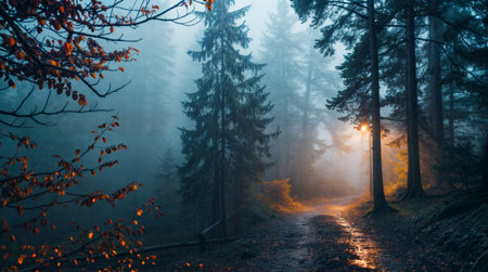 A serene misty forest pathway during autumn, adorned with vibrant orange leaves and surrounded by tall trees, creates a tranquil and atmospheric scene.