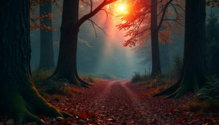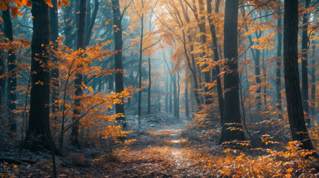 A tranquil autumn forest scene with a winding path covered in fallen orange leaves, framed by tall trees and illuminated by soft, misty natural light. Seasonal beauty and serenity.