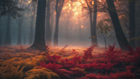 Beautiful forest landscape with colorful ferns and soft morning light during autumn