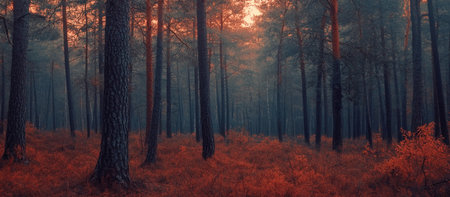 Foggy morning in the autumn forest. Pine forest at sunrise.