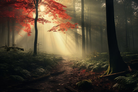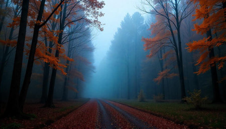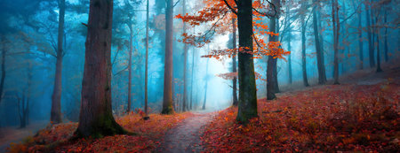 Misty forest path with trees in autumn foliage, featuring vibrant red leaves and a blue hued fog, creating a mystical atmosphere..