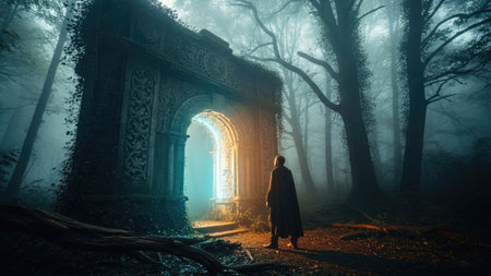 An atmospheric fantasy concept. Of a glowing alien portal in a spooky forest. On a foggy winters day