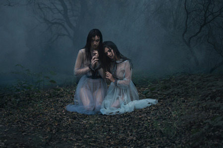 Two girls cry. Young ladies in vintage dresses sitting on the sinister a forest glade waiting for his victim. Photoshoot in the style of horror. Mystical photo. Fashion toning.Creative color.