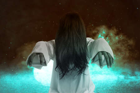Scary ghost woman standing with a mystical fire background. Halloween concept