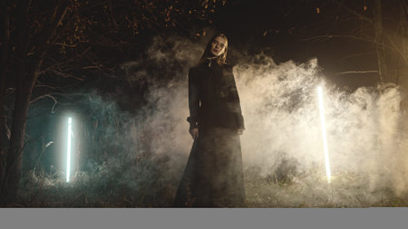 Fashion model is posing in a dark forest at night, wearing a long black dress, surrounded by smoke and illuminated by vertical neon lights, creating a mysterious and evocative atmosphere