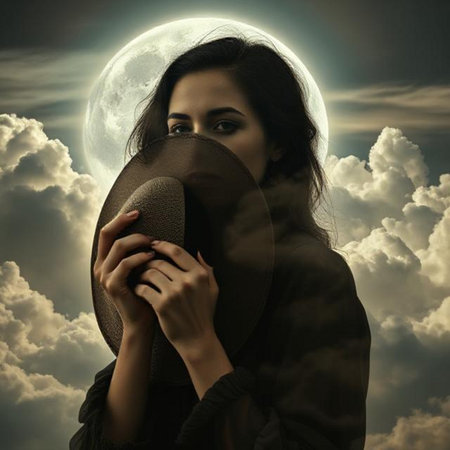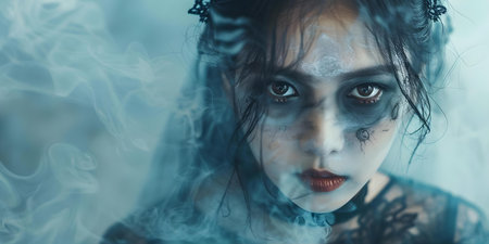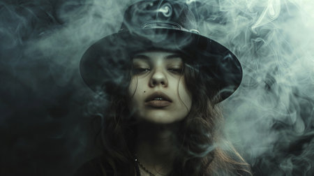 Mysterious witch with a hat surrounded by smoke. Enigmatic female character in a dark, mystical setting. Concept of magic, witchcraft, gothic, Halloween, and fantasy.