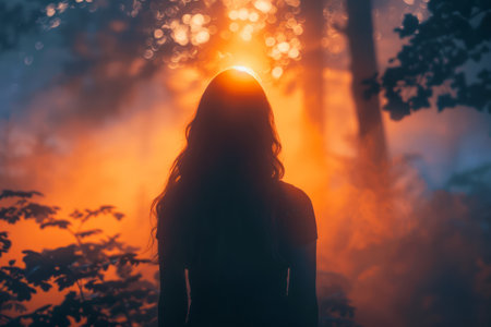 The soul seeks its own path. Composite image of a mans silhouette superimposed on a woman alone in the woods.