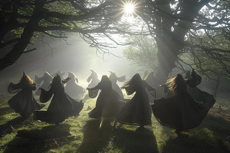 A captivating portrait of a woman in a dark dress, standing amidst a mystical forest at night. The atmosphere is both mysterious and beautiful.