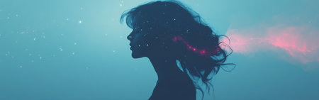 Woman, double exposure and stars in space, fantasy and art in cosmos, shine and thinking in solar system. Girl, galaxy and color with universe, nebula or milky way for night sky overlay with fashion