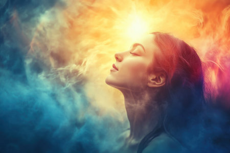 A woman closes her eyes as colorful light and smoke swirl around her, reflecting a moment of inspiration.