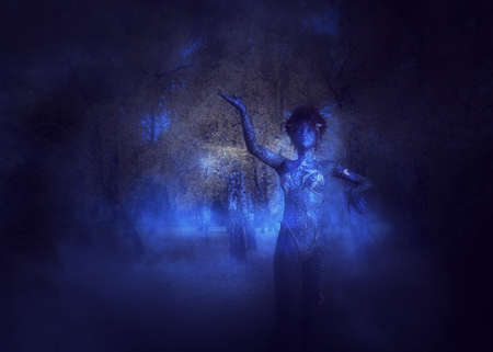 Fantasy dryad woman with tree trunk leg in night autumn forest, 3d Illustration.