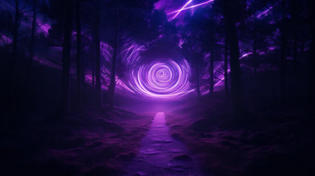 An ethereal forest bathed in vibrant hues of purple and blue, with fog creating a mysterious atmosphere.