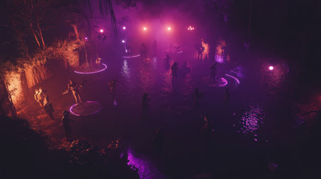 Fun in night club with laser light. Silhouetted Figures at Futuristic Light Show with Glowing Particles