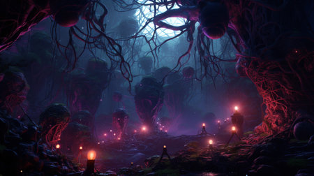 Mysterious dark forest with magic light and purple flowers. Fantasy landscape