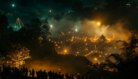 Vibrant concert stage with dramatic smoke and dynamic lighting effects
