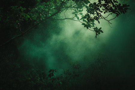 Misty rainforest exudes a mysterious atmosphere with vibrant green hues and rising fog