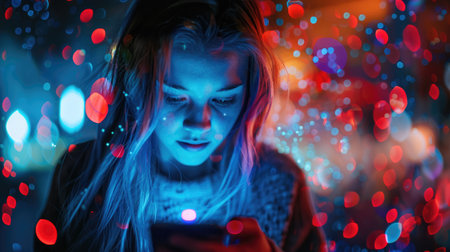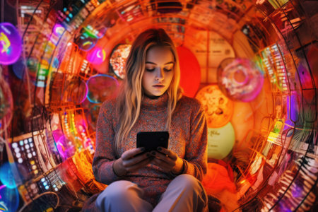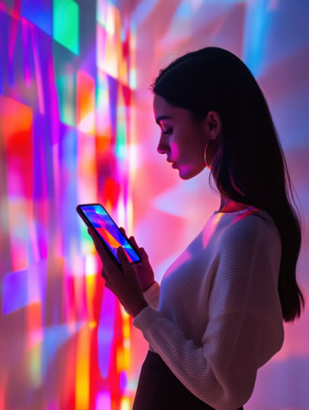 A young woman stands against a wall filled with vibrant, colorful projections while engaged with her smartphone in the evening.