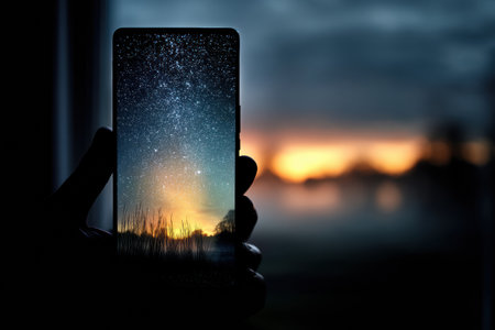 A hand holds a phone displaying a stunning view of a starry landscape during dusk. The vibrant sky shows celestial bodies against a fading light.