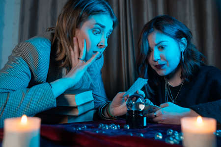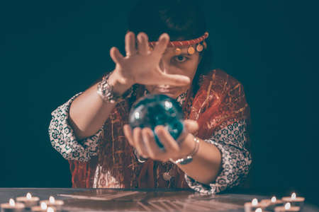 Fortune teller with tarot cards on table near burning candles.Tarot cards spread on table with crystal ball.Forecasting concept.