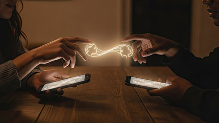 Two individuals interact using smartphones with a digital connection displayed between them. The image features a shallow depth of field, focused on hands, with warm lighting and a neutral background. The composition suggests communication and digital relationships suitable for various commercial purposes.