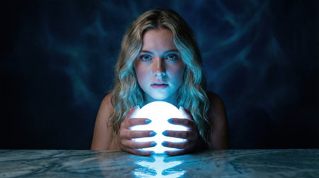 A young clairvoyant woman with a serious expression holds a luminous crystal sphere in a dark room, using her psychic abilities to predict the future.