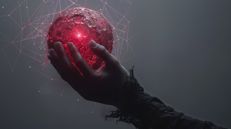 Hand Holding Glowing Red Orb, Technology and Magic Concept, Digital Art, 3D Render, Surrealism