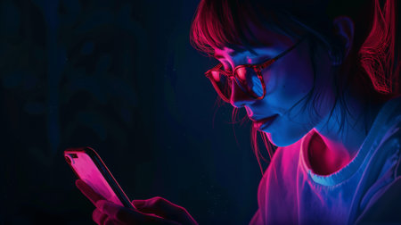 A young adult dressed in a stylish jacket focuses on their smartphone while surrounded by dramatic colored lighting in an urban environment.