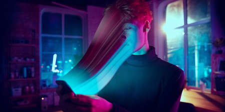Cinematic portrait of stylish man in neon lighted interior using a smartphone. The face is smeared, sucked, absorbed into the phone. Concept of social network dependency, phone addiction.