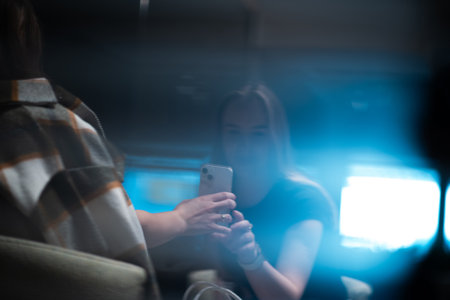 Silhouette of Young Woman Using Smartphone Under Dramatic Blue Spotlight in Dark Room