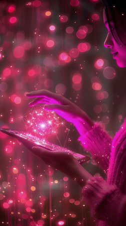 Hand holding illuminated smart phone, close up of touch screen technology generated by artificial intelligence