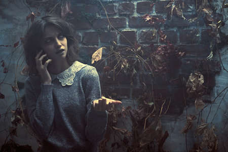 Frightening ghost girl with faded eyes and dusty black hair involved in a phone conversation. Gloomy ruined wall background. Copy space.