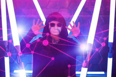 A portrait of teenage boy in a black hoodie, mask and black sunglasses hiding his face working with holographic data on virtual screen. Studio shot among neon lights. Teen hacker in cyberspace.