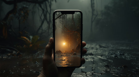 a person holds a smartphone displaying a picture of a jungle, showcasing the stunning beauty of unreal engine 5. the image features a dramatic atmospheric perspective with dark gray and light amber tones. the artwork captures an apocalyptic theme with subtle lighting and water droplets, creating a mesmerizing visual experience. ai generated