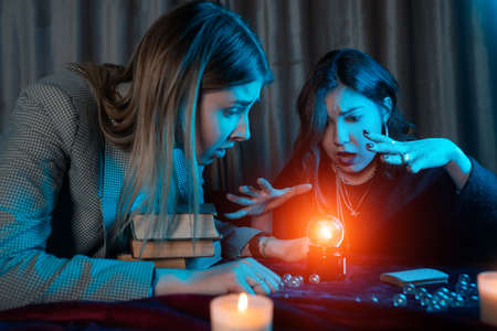 Fortune teller or witch hands and a glowing magic ball. Halloween, magic and tricks concept
