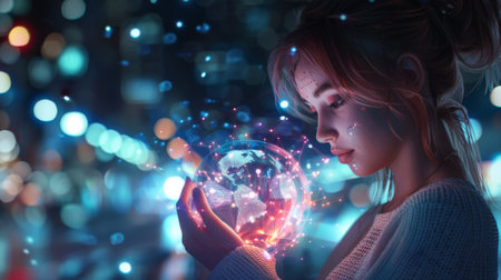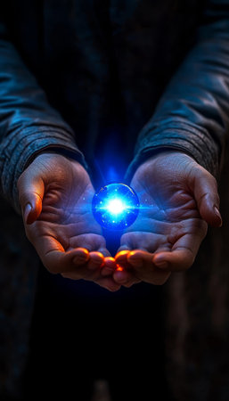 An individual's hands cradle a luminous energy sphere radiating a vibrant blue hue. The image features a shallow depth of field, emphasizing the glowing orb against a dark background. The scene suggests a conceptual representation, suitable for use in design, illustration, and various creative projects.