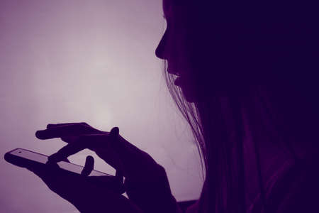 Silhouette of a girl holding smartphone and scrolling on purple very peri trendy color 2022 background. Young woman in profile using a cell phone, looking for information on the Internet, chatting online.